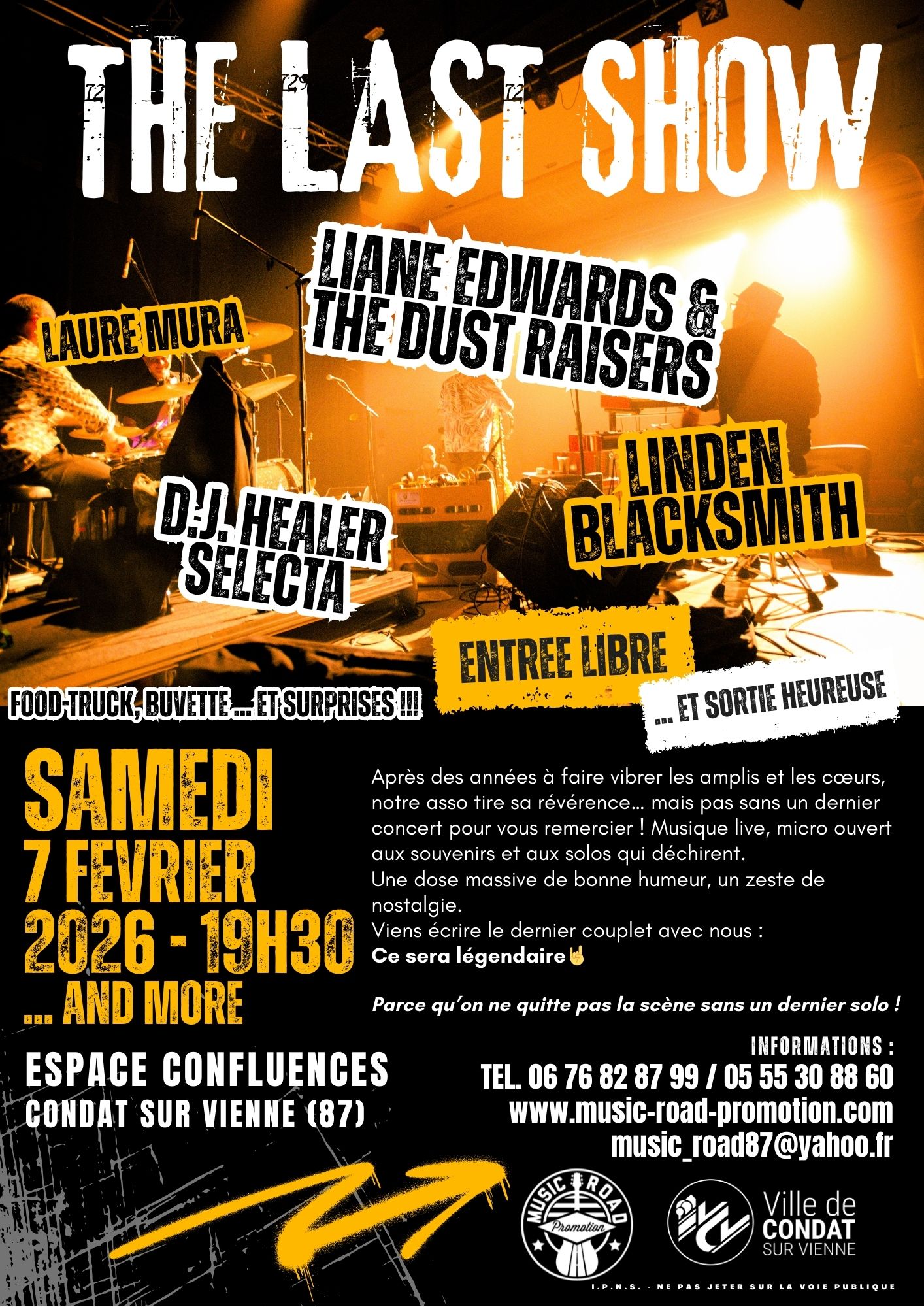 Depuis 2006, elle a organisé une quarantaine de concerts, country, blues, rock’n roll et musique irlandaise, principalement à l’Espace Confluences à Condat sur Vienne (87).
